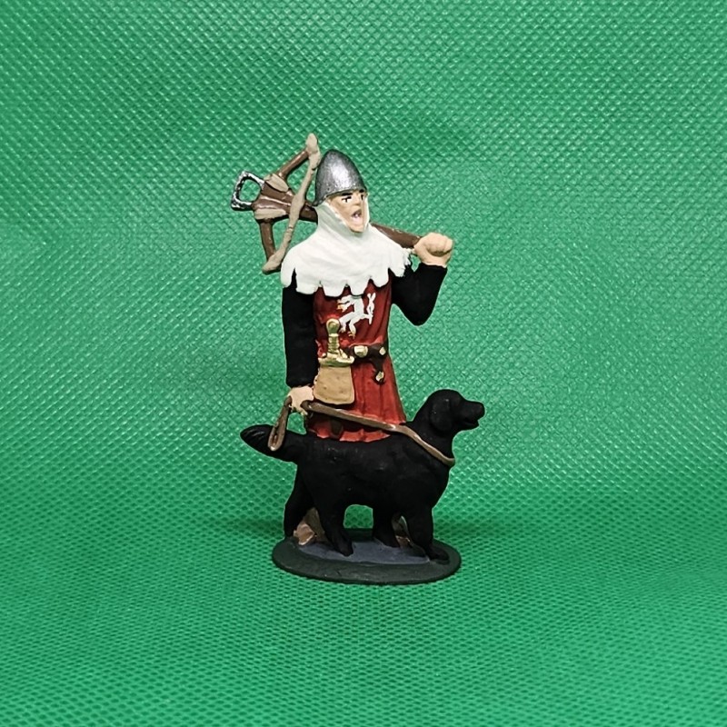 Cínová figurka lovčího s kuší a psem.