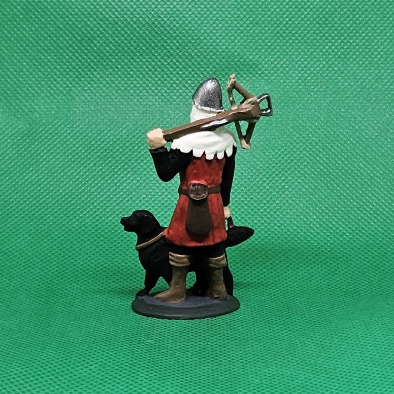 Ručně malovaná cínová figurka lovčího s kuší a psem. Výška postavičky cca 6 cm, celková výška 6 cm, hmotnost cca 70 g.
