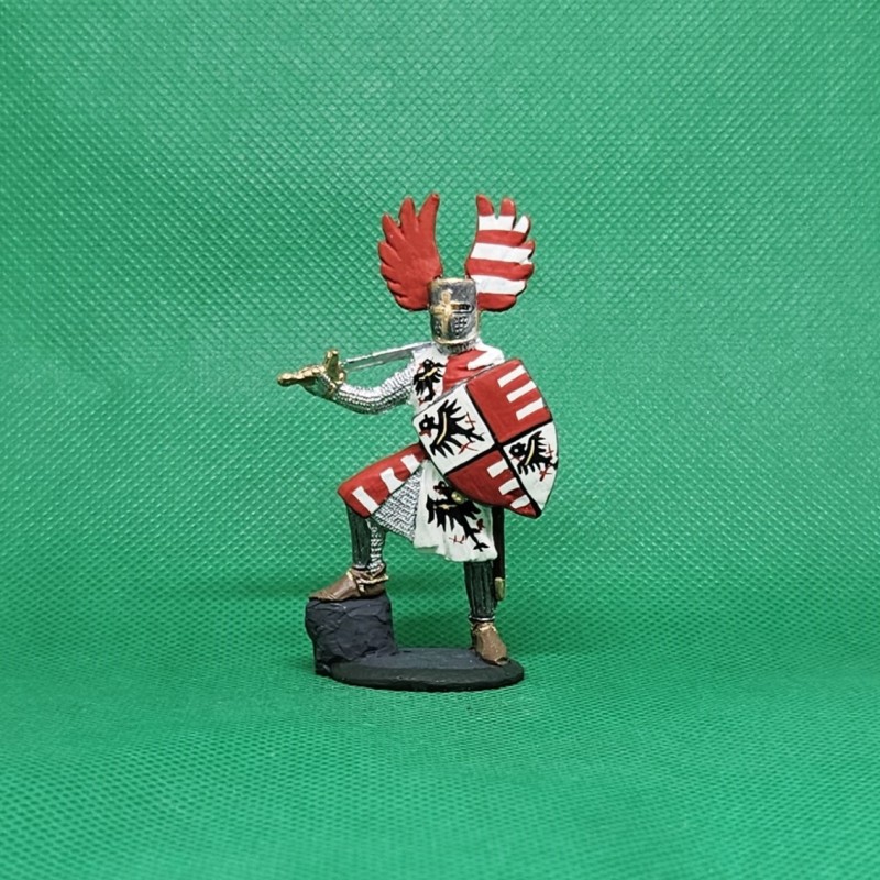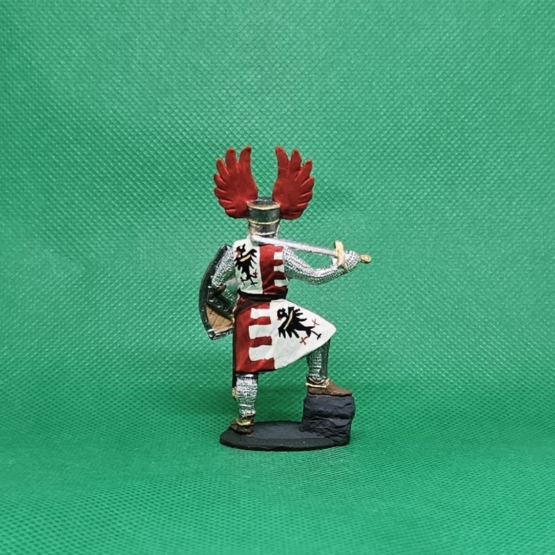 Ručně malovaná cínová figurka středověkého rytíře v brnění s mečem a štítem, celková výška cca 7,5 cm, hmotnost cca 70 g.