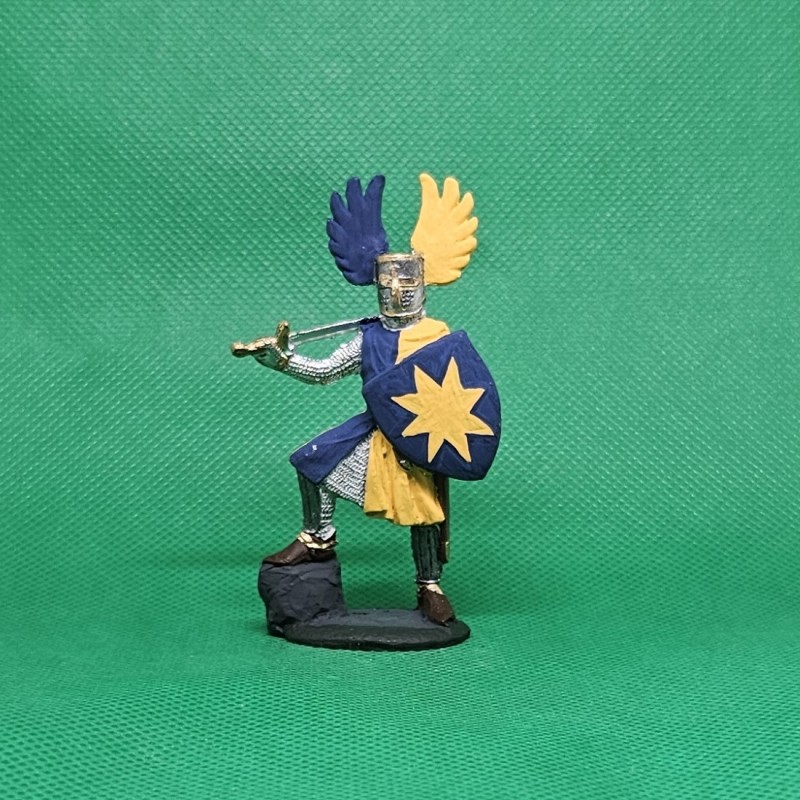 Ručně malovaná cínová figurka středověkého rytíře v brnění s mečem a štítem, celková výška cca 7,5 cm, hmotnost cca 70 g.