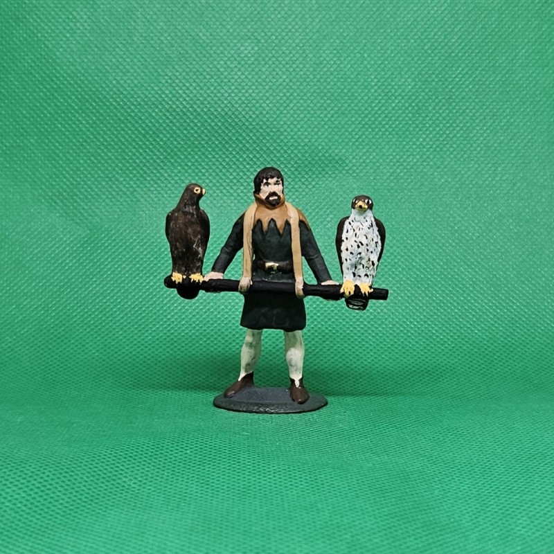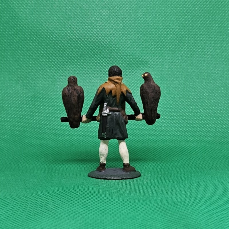 Ručně malovaná cínová figurka středověkého sokolníka se dvěma dravými ptáky na bidle, výška cca 6 cm, hmotnost cca 77 g.