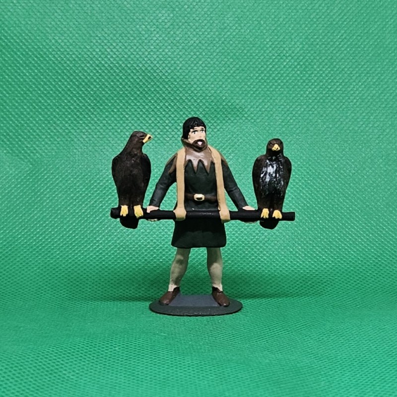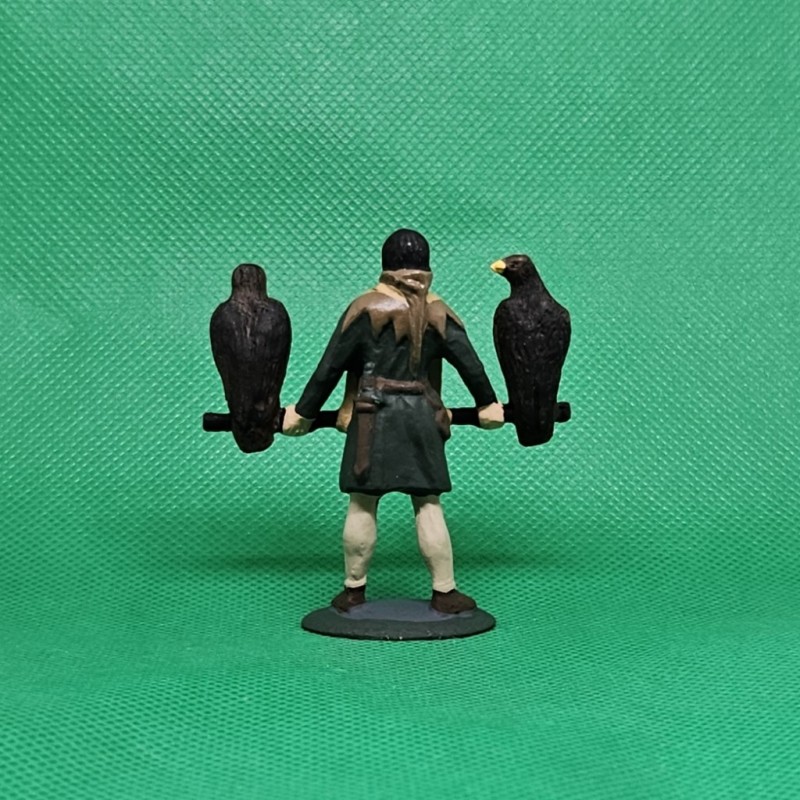 Ručně malovaná cínová figurka středověkého sokolníka se dvěma dravými ptáky na bidle, výška cca 6 cm, hmotnost cca 77 g.