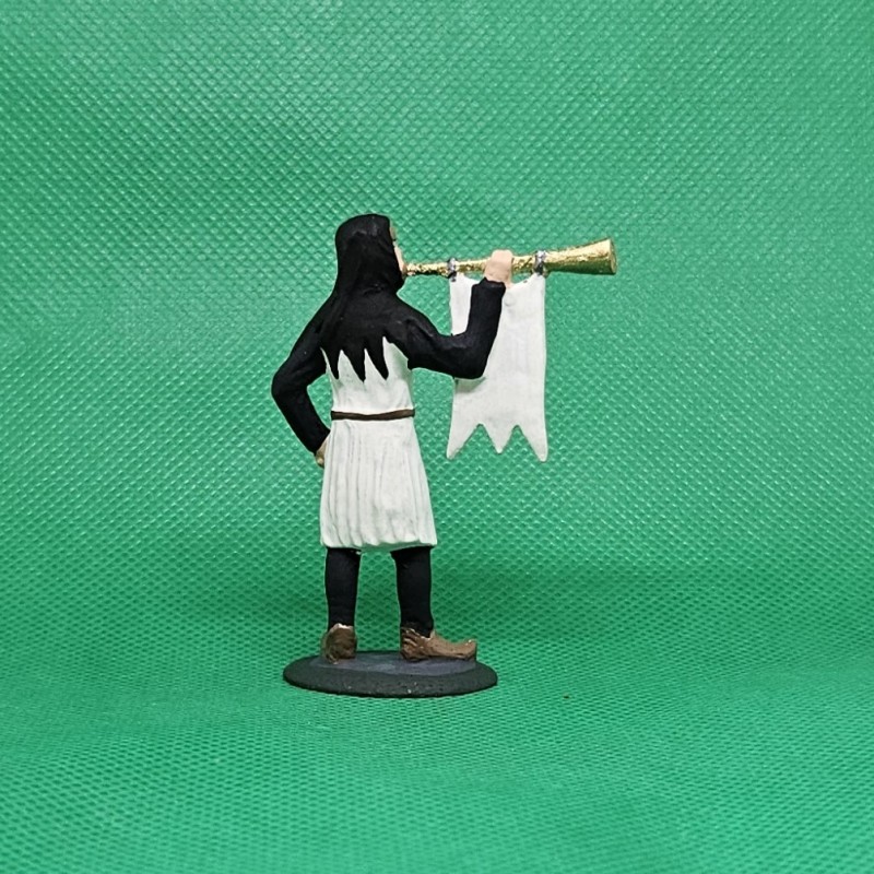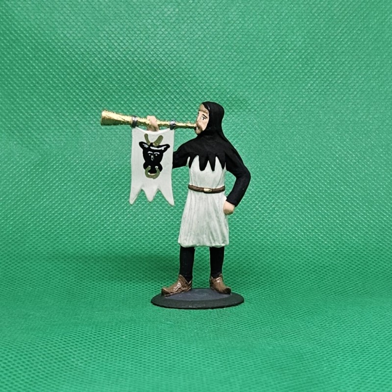 Cínová figurka trubače s trubkou, výška samotné figurky je asi 6,5 cm, hmotnost 50 g.