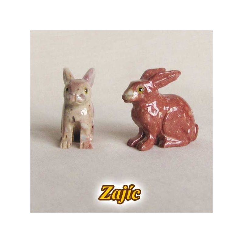 Figurka zajíce či králíka vybroušená z peruánského kalcitu o velikosti 3,5 x 4 x 1,5 cm, hmotnost je cca 20 g.