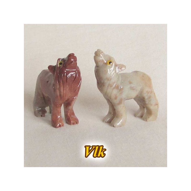 Figurka vlka vybroušená z peruánského kalcitu o velikosti 3,5 x 3,5 x 1,5 cm, hmotnost je cca 15 g.