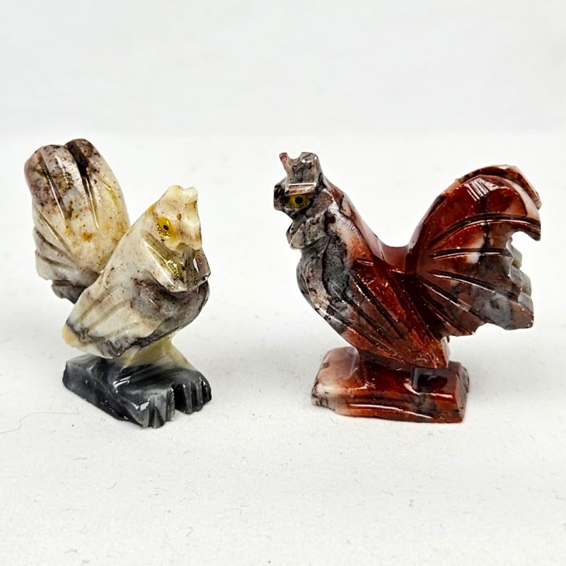 Figurka kohouta (či možná slepičky) vybroušená z peruánského kalcitu o velikosti 3,5 x 3,5 x 1,5 cm, hmotnost je cca 15 g.