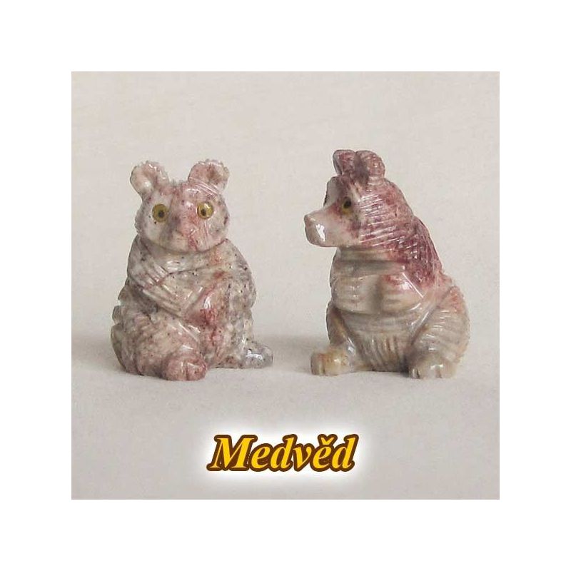 Figurka medvěda vybroušená z peruánského kalcitu o velikosti 3,5 x 2,5 x 2,5 cm, hmotnost je cca 25 g.