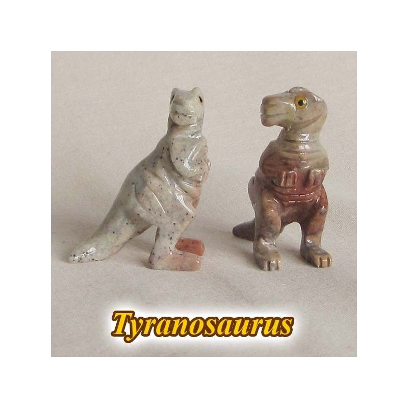Figurka tyranosaura vybroušená z peruánského kalcitu o velikosti 4 x 3 x 1,5 cm, hmotnost je cca 13 g.