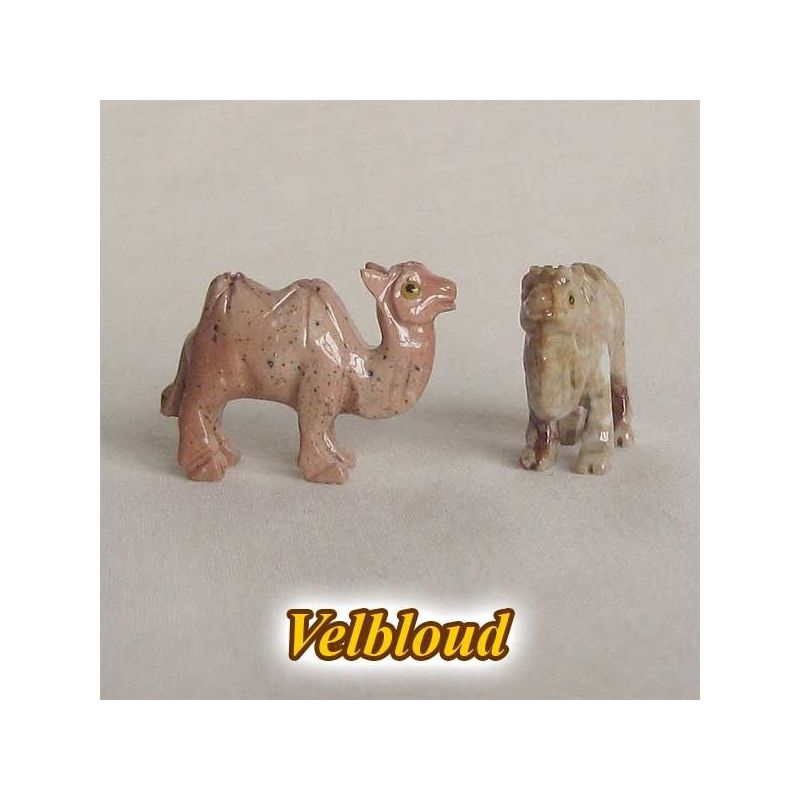 Figurka velblouda vybroušená z peruánského kalcitu o velikosti 3,5 x 3 x 1,5 cm, hmotnost je cca 15 g.