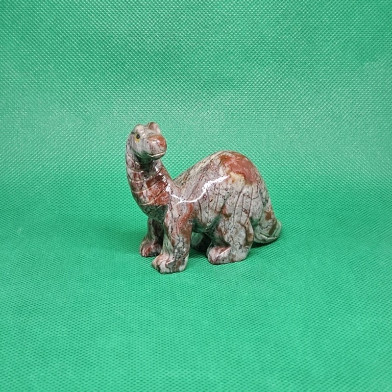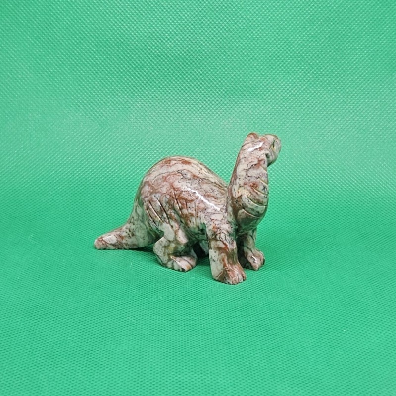 Figurka brontosaura vybroušená z peruánského kalcitu, hmotnost cca 120 g.