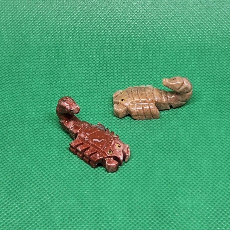 Figurka štíra vybroušená z peruánského kalcitu o velikosti 4 x 2 x 2 cm, hmotnost je cca 10 g.