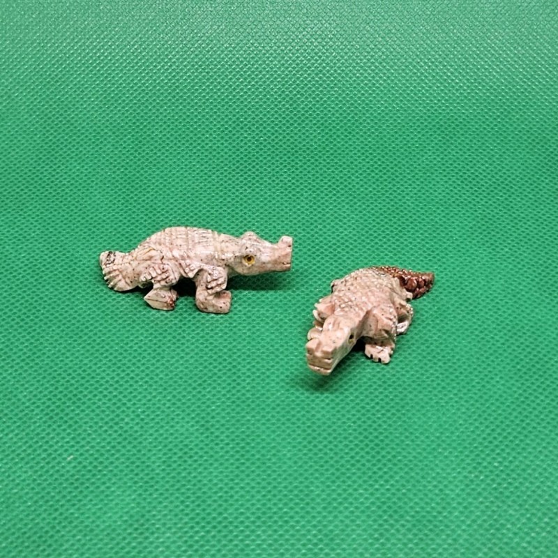 Figurka krokodýla vybroušená z peruánského kalcitu o velikosti 4,5 x 2 x 1,5 cm, hmotnost je cca 10 g.