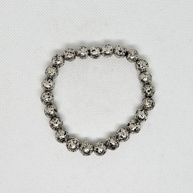 Náramek je tvořen kuličkami lávového kamene o průměru cca 8 mm, navlečenými na strečové gumě.