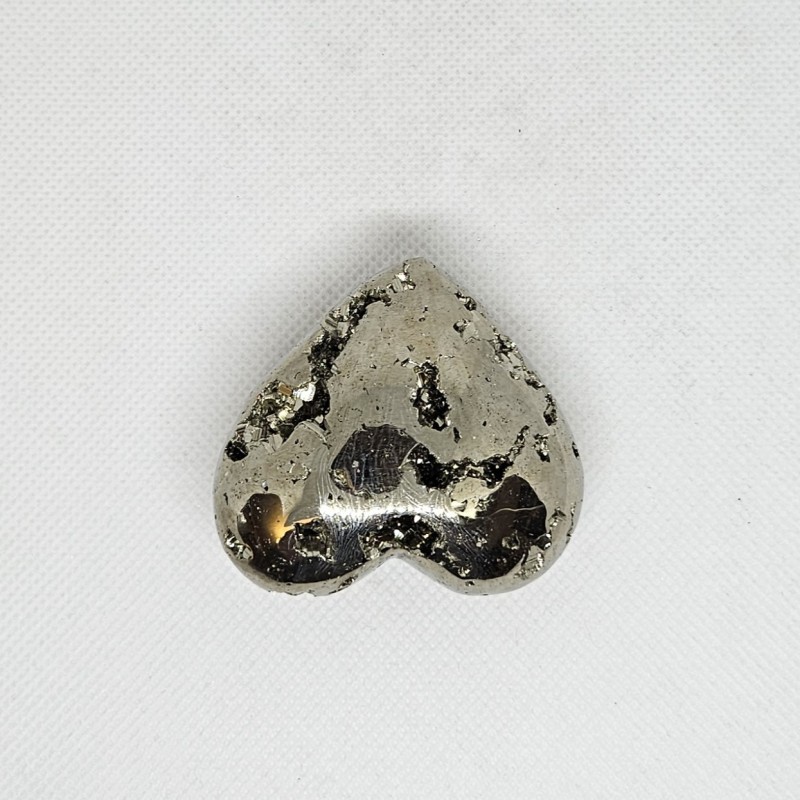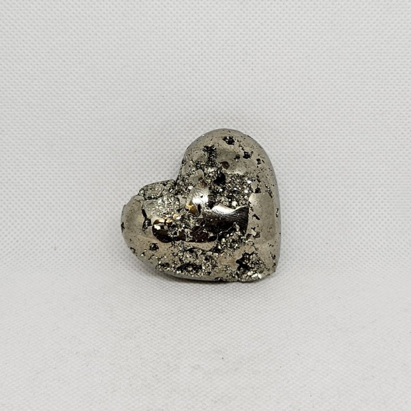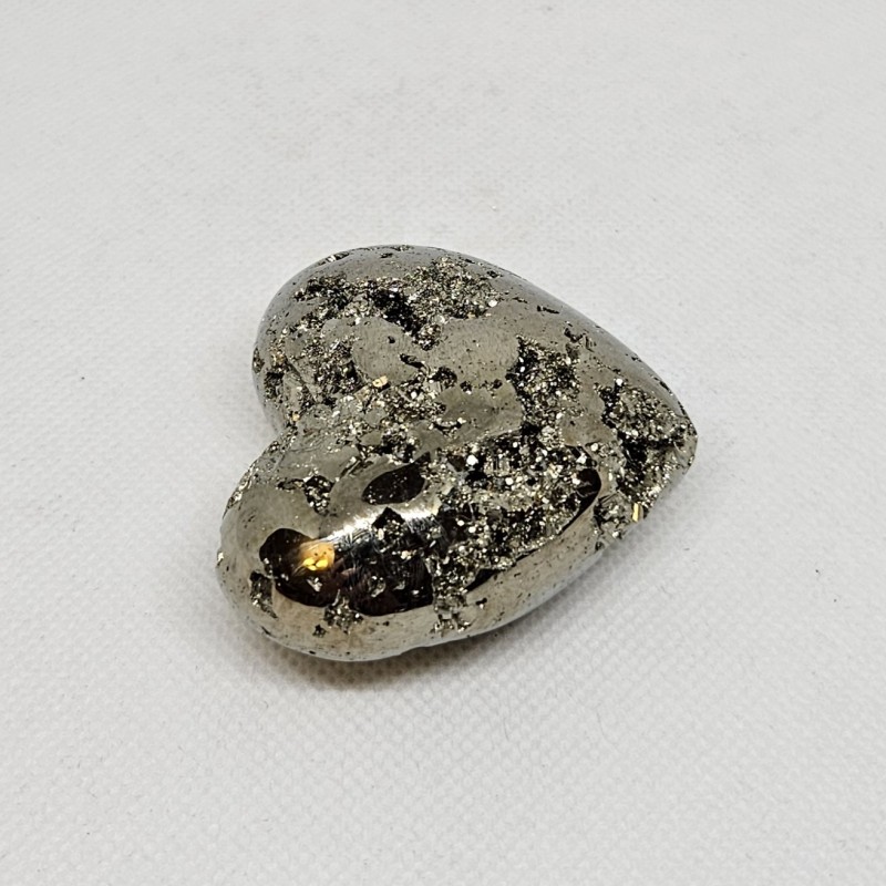 Ručně broušené srdce z peruánského pyritu, o velikosti 5,5 x 5 x 2,5 cm.