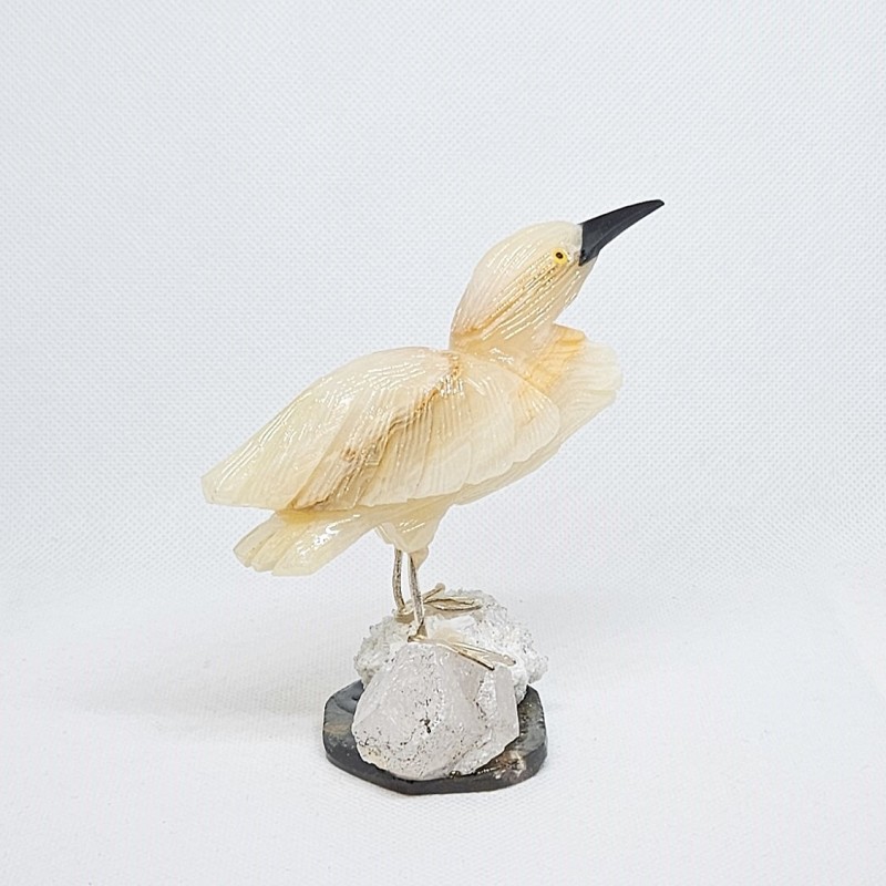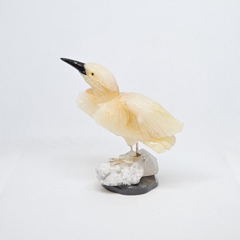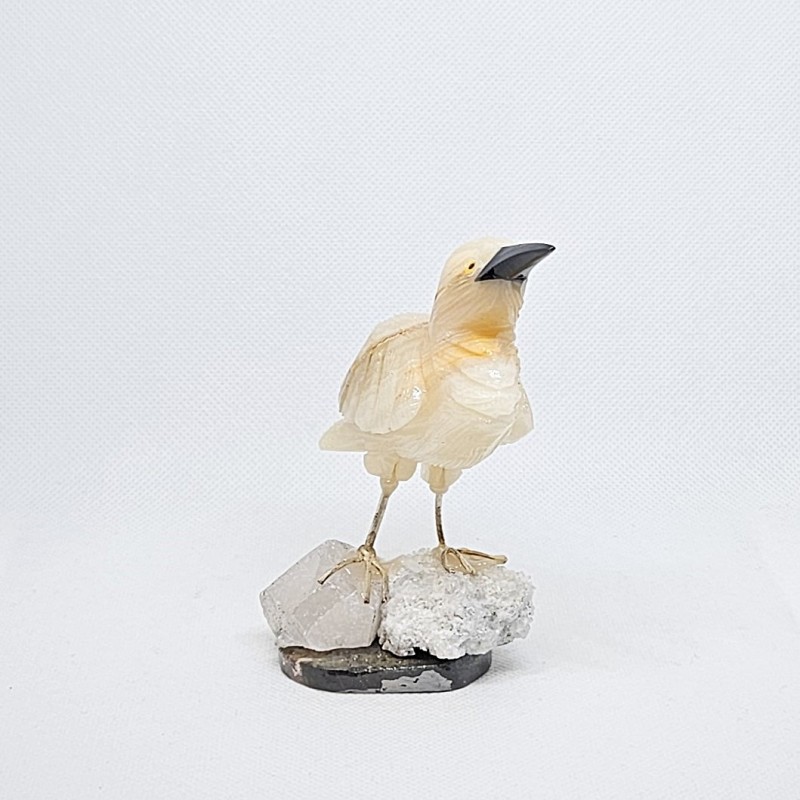 Figurka volavky, vybroušená a slepená ze dvou druhů polodrahokamů, podstavec tvoří nerost kalcit.