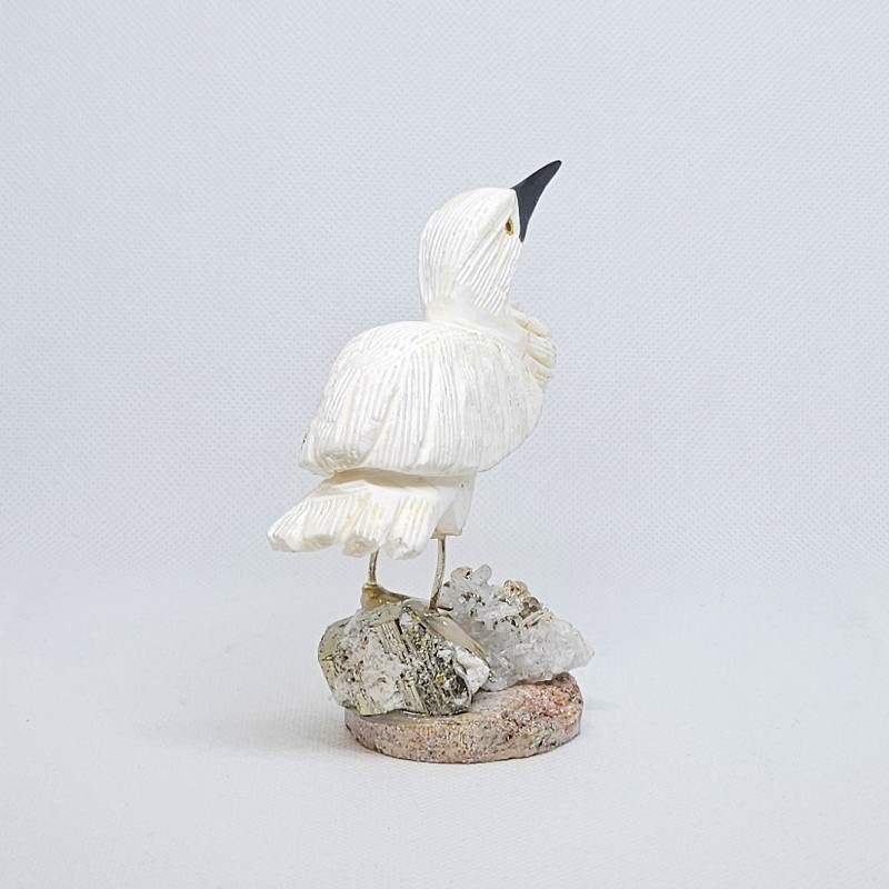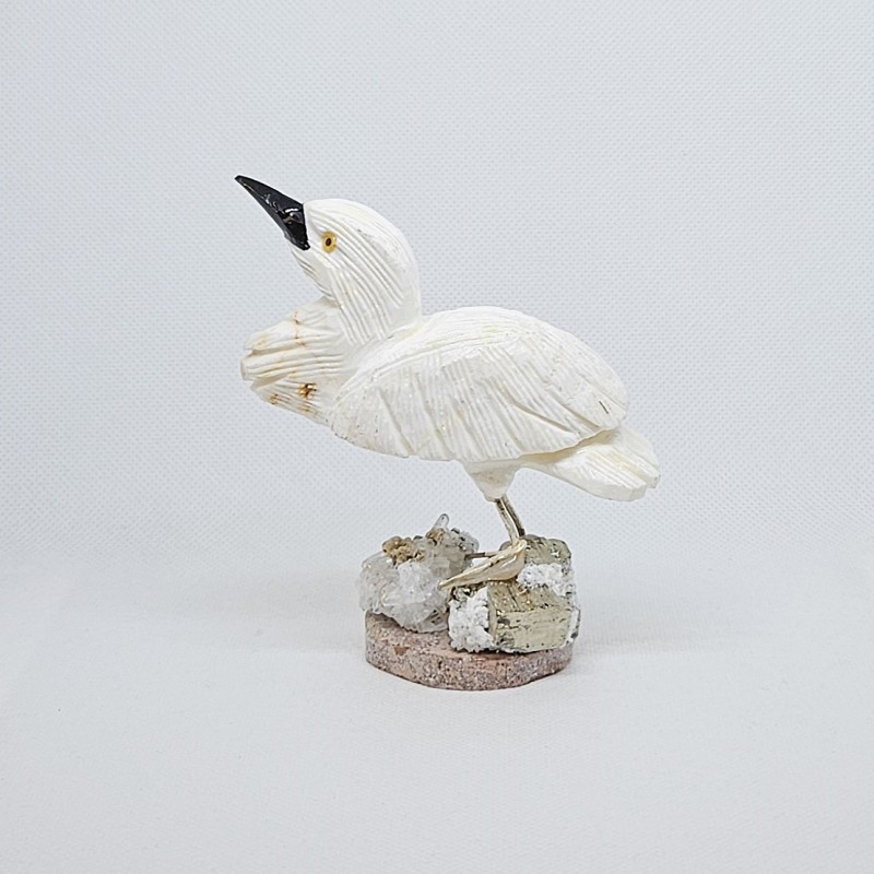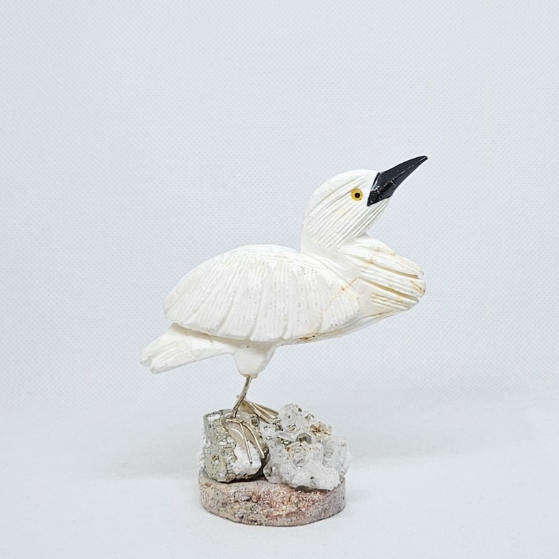 Figurka volavky, vybroušená a slepená ze dvou druhů polodrahokamů, podstavec tvoří nerosty kalcit, pyrit a křišťál , celková hmotnost ptáčka je cca 188 g, rozměry jsou cca 11 x 9 x 5 cm.