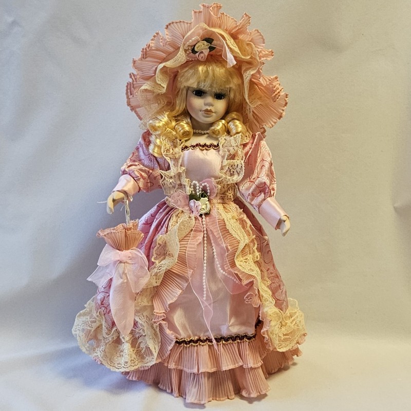 Něžná blondýnka v princeznovských šatech elegantního růžového ladění, s imitací paraplíčka a velkým kloboukem.