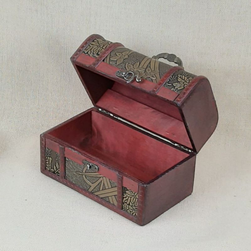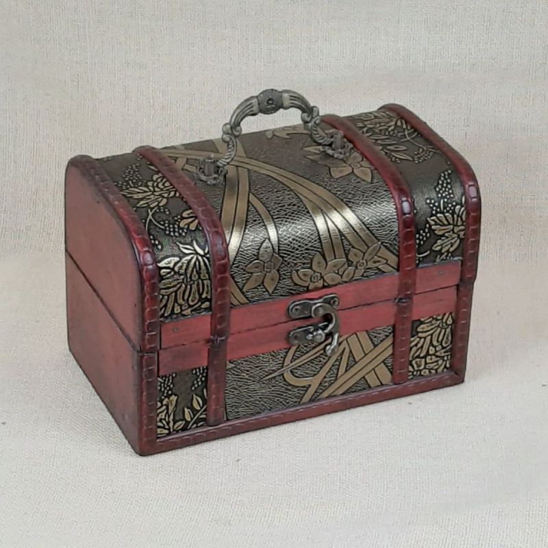 Dřevěná truhlice z překližky zdobená koženkou a nýty, určená k uschování malých i velkých pokladů, či dokladů. Rozměry 17,5 x 10,5 x 12cm (výška). Nejmenší ze tří velikostí na společné fotce.
