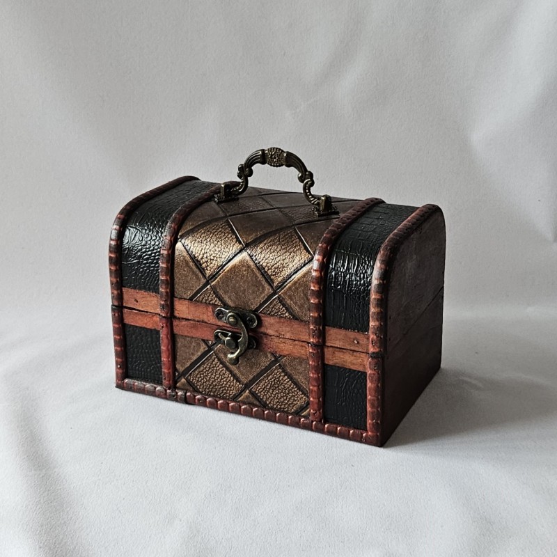 Dřevěná truhlice z překližky zdobená dvěma druhy koženky, určená k uschování malých i velkých pokladů, či dokladů.
