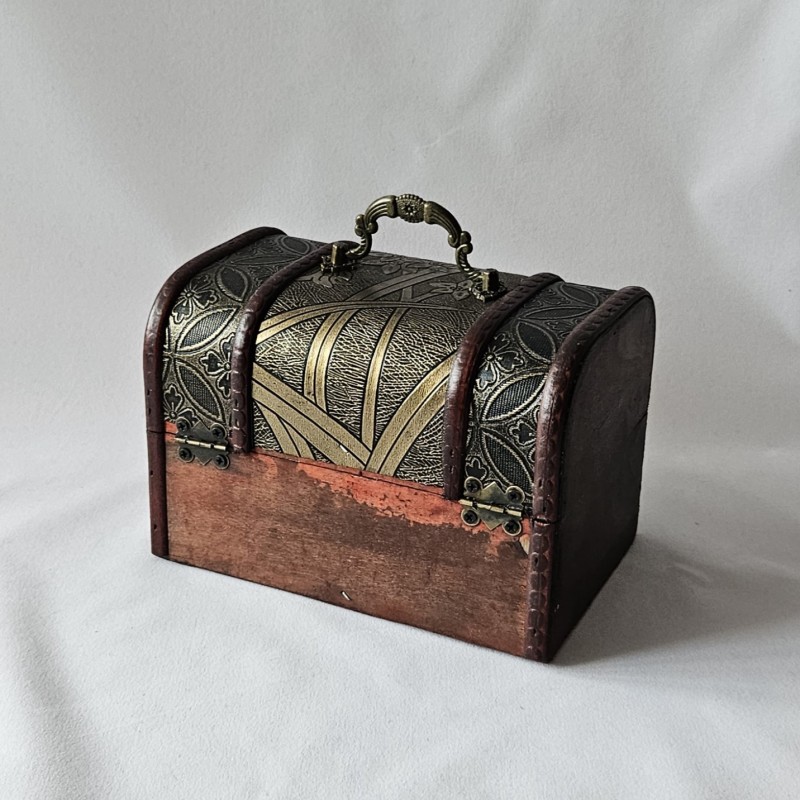 Dřevěná truhlice z překližky zdobená dvěma druhy koženky, určená k uschování malých i velkých pokladů, či dokladů.